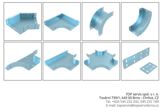 Ke žlabům TKZ dodáváme i všechny tvarové prvky (kolena, T-kusy, kříže…). Pro spojení žlabů je nutné použít přikládací spojky na boky a dno, tvarové prvky jsou opatřeny integrovanými spojkami.